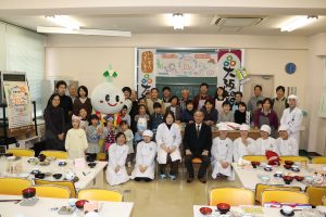 まず、大阪ガスの方の「ダシのおはなし」を聞いてから、お正月料理として、「吹田くわいの炊き込みご飯」「吹田くわい入り雑煮」を吹田市民の方が、デザートの「吹田くわい入りゴマ団子」は食物栄養学科の学生が作りました。