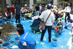 当日のイベントには、地元の小学生など100名ほどが参加し、くわいの種芋をバケツに植えつけました。