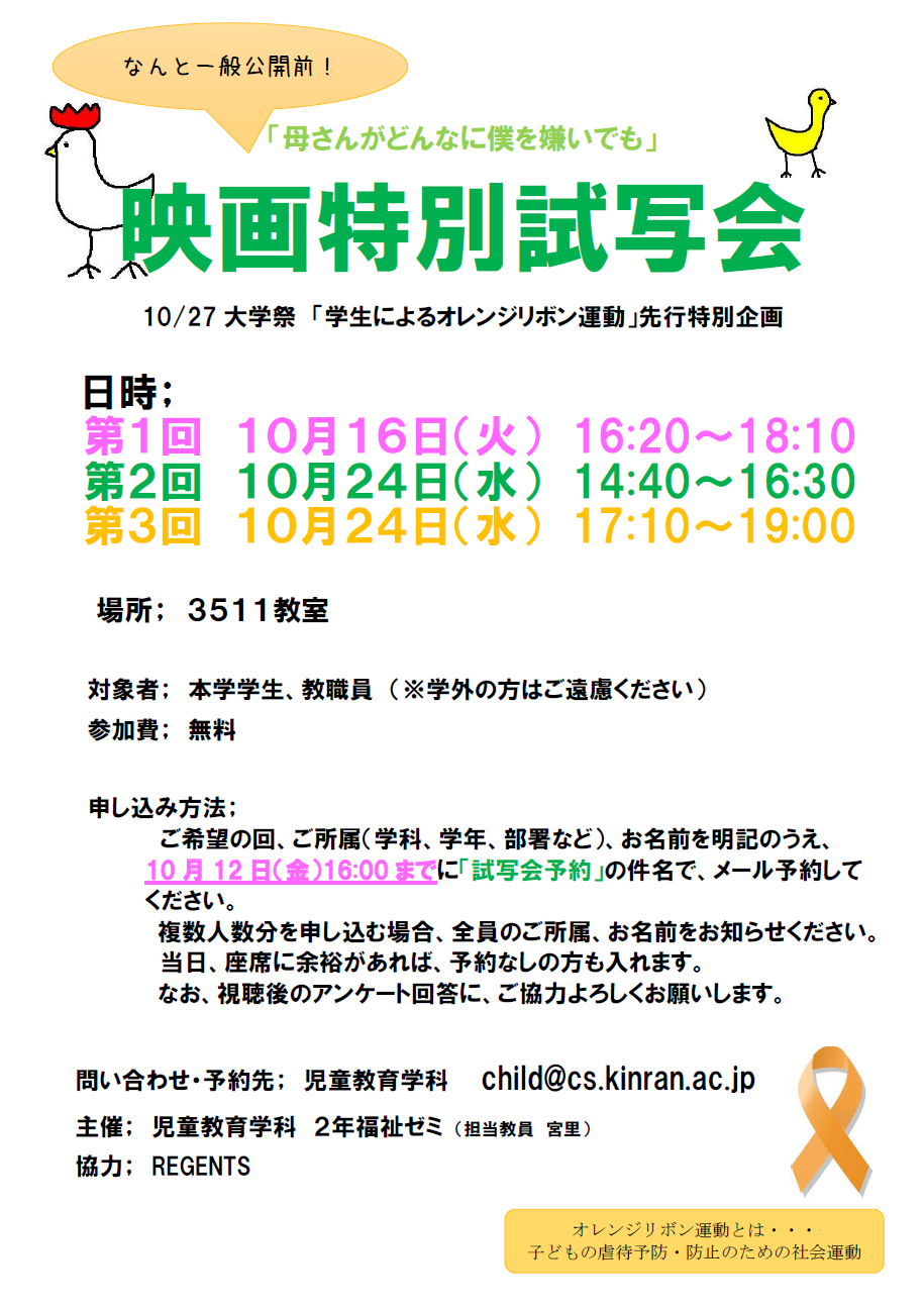 「学生によるオレンジリボン運動」(子ども虐待防止・予防の啓発運動)の特別企画として、映画の試写会を実施します。11月に全国公開される映画を千里金蘭大学の学生限定で先行鑑賞できる特別試写会です。
