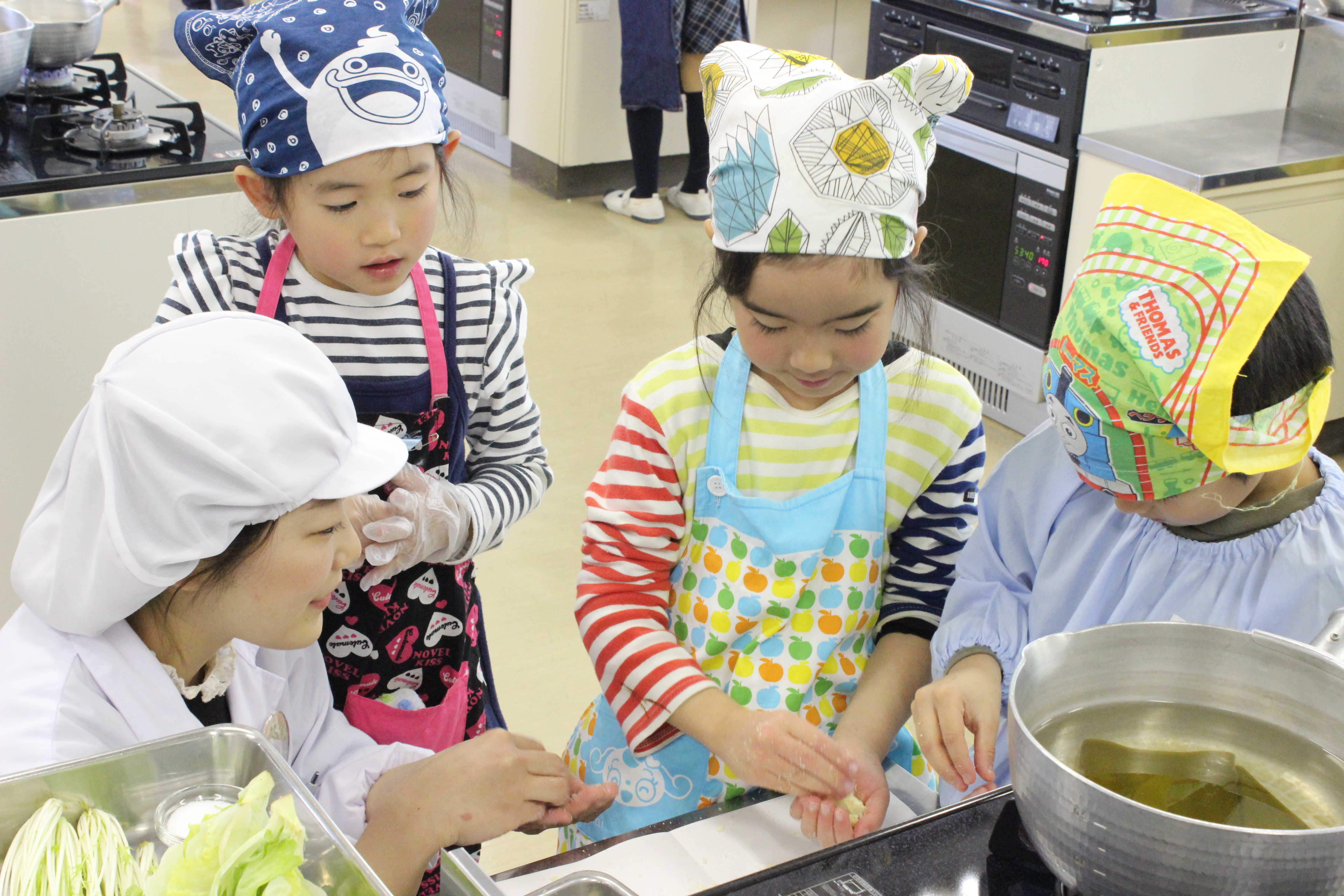 その後、くわいを使用した料理作りを行い、本学生活科学食物栄養学科の学生も調理補助を行いました。
