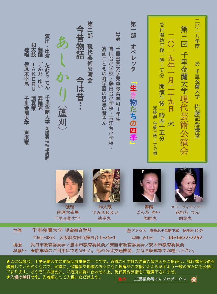 この公演会は、千里金蘭大学の地域交流事業の一つです。近隣小学校の児童の皆さんを招待し、現代舞台芸術を鑑賞してもらうもので、同時に、保護者や地域の方々にご理解・ご支援をいただくために、一般の方々にも公開しております。