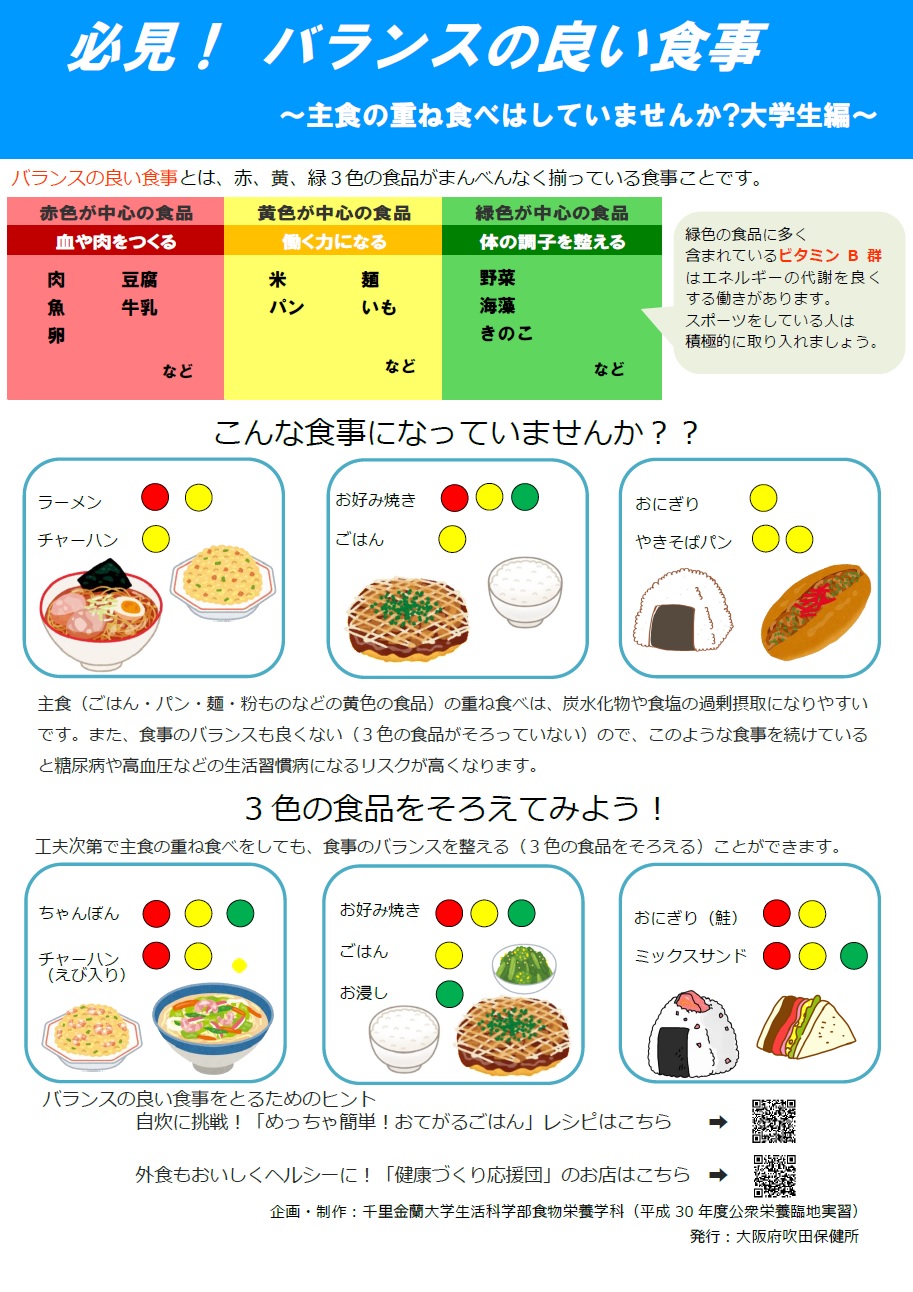 大阪府吹田保健所が取り組む「大学健康啓発プロジェクト」の一環で、本学の学生(2018年度公衆栄養臨地実習参加学生)が大学生向けのリーフレットを作成しました。このリーフレットは、吹田市内の大学にて学生に配布される予定です。