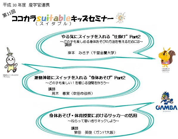 今年度から始まった産学官が連携したセミナーは、それぞれの視点及び特徴を活かして、子どもの「こころ」と「からだ」の健やかな育ちにつながる“いろいろな身体の使い方”や“やる気につながるアプローチ方法”の紹介等、大学があるまち、ガンバがあるまち、吹田市ならではの情報発信の1つとして、実施しています。