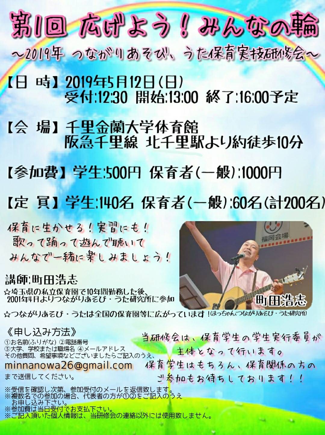 2019年5月12日(日)に千里金蘭大学を会場として、「第1回 広げよう!みんなの輪~2019年つながりあそび・うた保育実技研修会~」(主催:「みんなの輪実行委員会」)が開催されます。