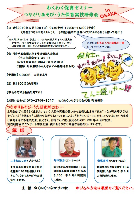 2019年6月30日(日)に、千里金蘭大学を会場として、「わくわく保育セミナー つながりあそび・うた保育実技研修会 in OSAKA」(主催:ぬくぬくつながりの会)が開催されます。