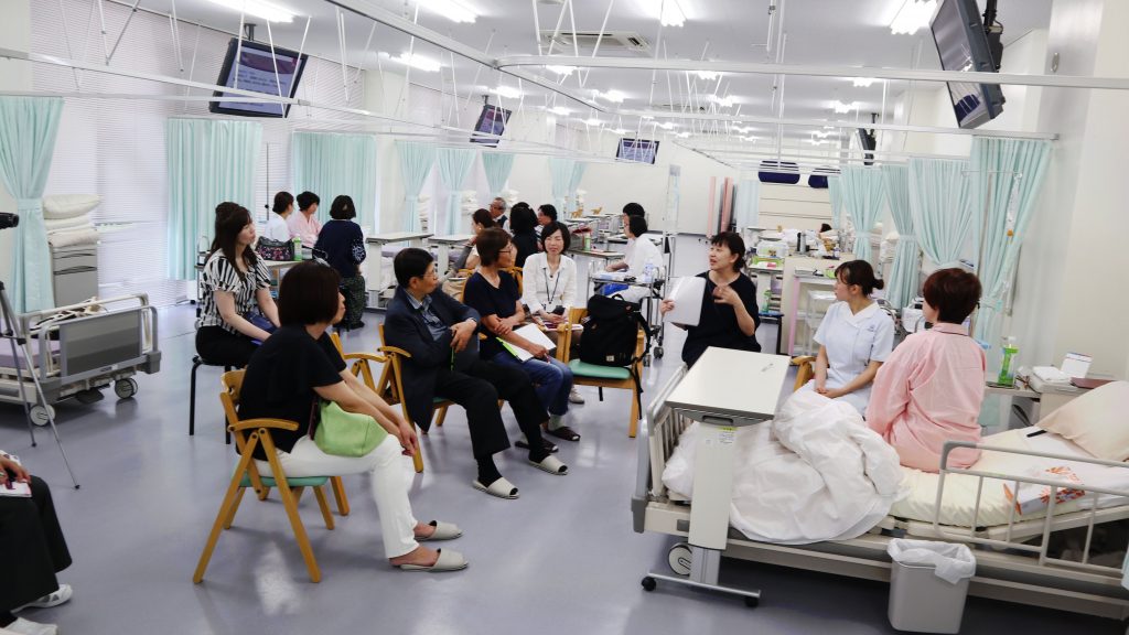 千里金蘭大学看護学部では、模擬患者参加型の演習を導入しています。模擬患者参加型の演習は、地域の皆さまのご協力により学内の演習をよりリアルな臨床現場に近づけるための取り組みです。