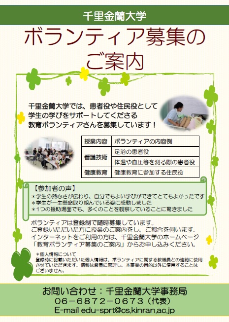 千里金蘭大学では、患者役や住民役として学生の学びをサポートしていただく「教育ボランティア」に登録してくださる方を募集しています!