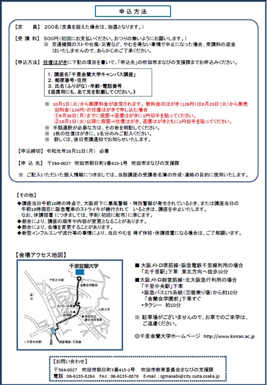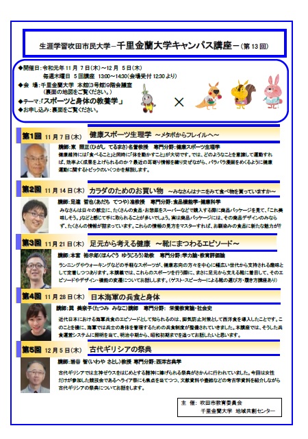 生涯学習吹田市民大学~千里金蘭大学キャンパス講座~(第13回)開催のお知らせ