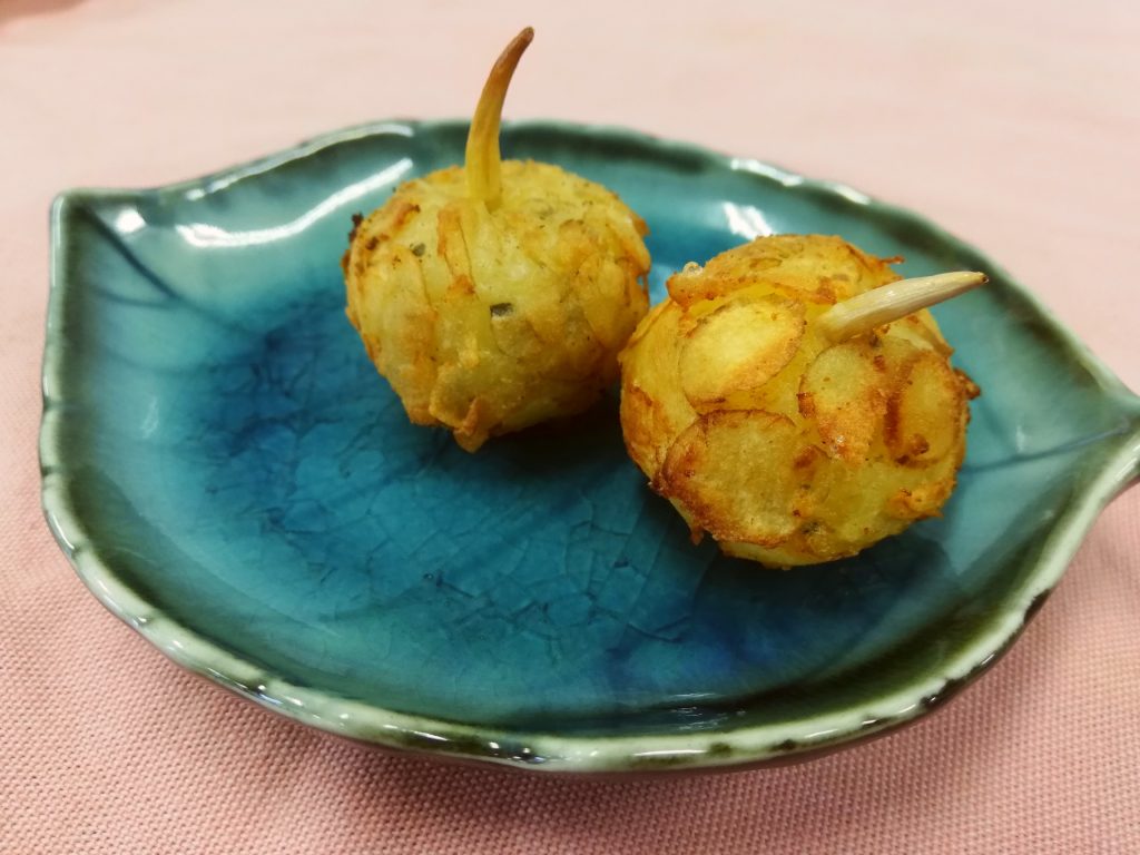 マッシュしたじゃがいもとチーズをまぜ丸くし、周りにスライスした吹田くわいをまぶし油で揚げました。芽をさせば大きな吹田くわい!お子様に大人気の一品。