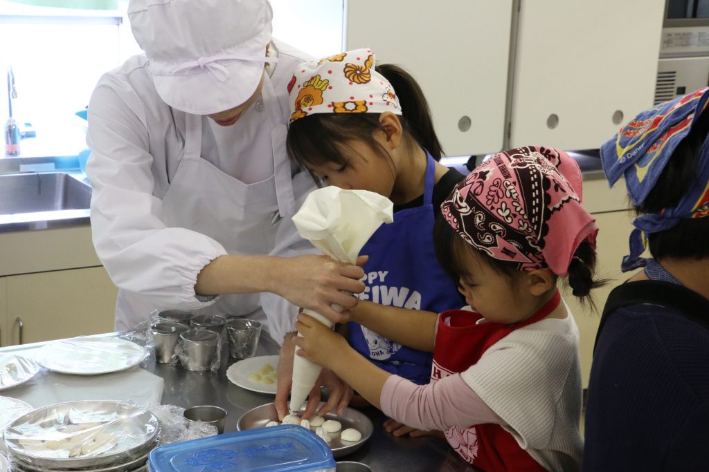 その後、くわいを使用した料理作りを行い、本学生活科学部食物栄養学科の学生も調理補助を行いました。
