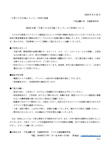 政府の緊急事態宣言の解除を受け、7月1日(水)より、毎週水曜日の子育て支援事業「子育てひろばOh!キッズ」を再開いたします。