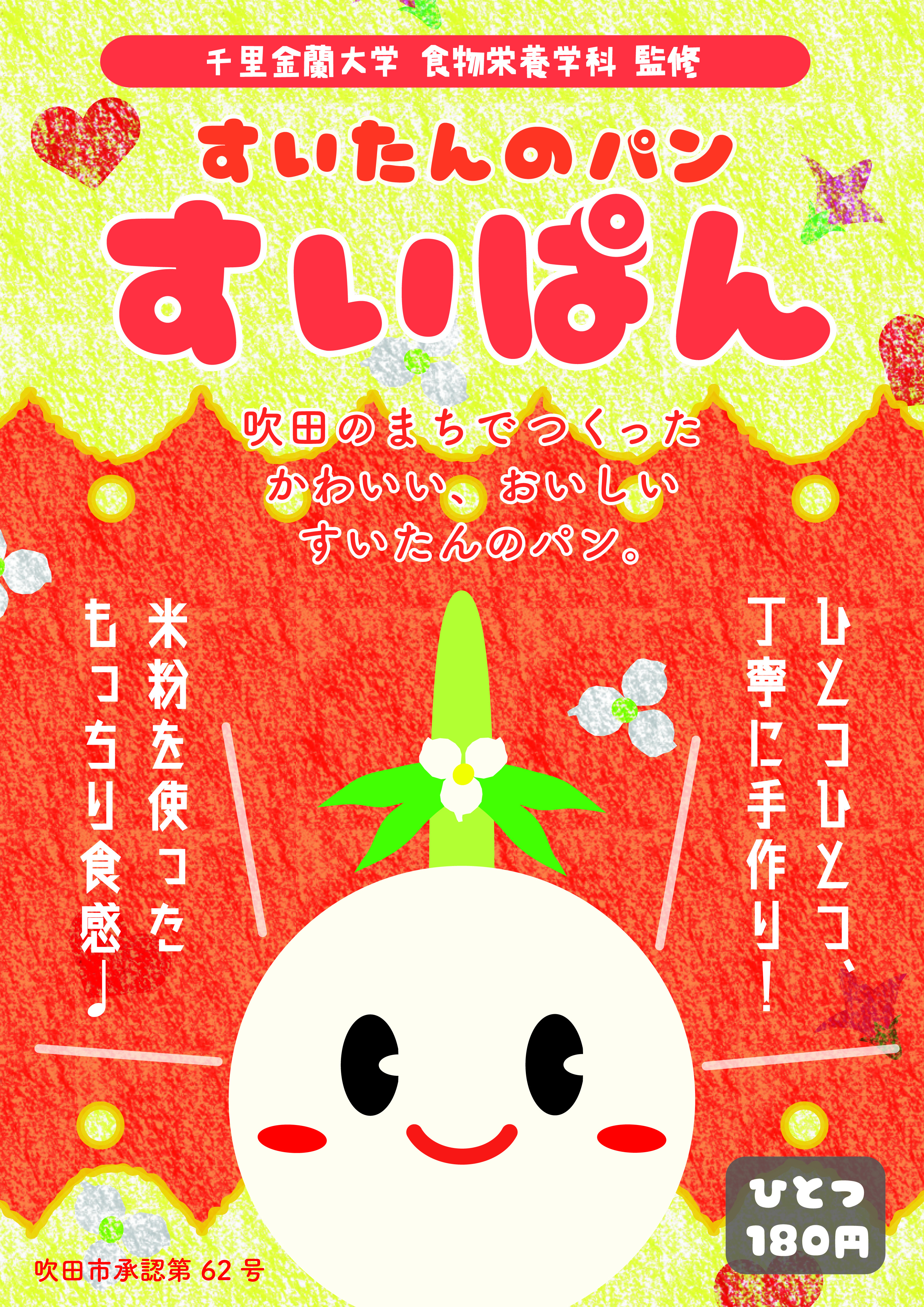 吹田市市イメージキャラクター「すいたん」の形のパンを、千里金蘭大学食物栄養学科・吹田市障がい者の働く場事業団との三者連携のもと作成し、販売するものです。