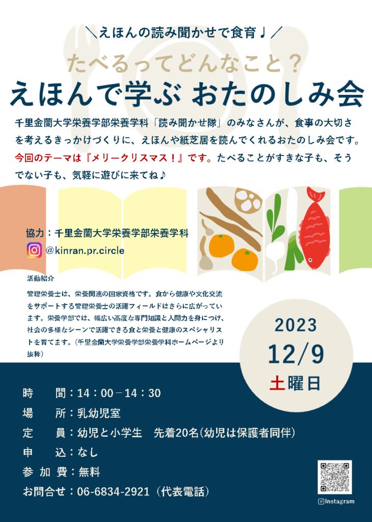 2023年12月9日(土)にまちなかリビング北千里にて、千里金蘭大学栄養学部栄養学科の「読み聞かせ隊」の学生が「えほんで学ぶおたのしみ会」を開催いたします。