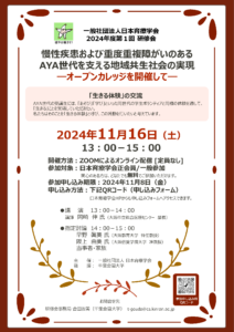 【11/16開催】研修会「慢性疾患および重度重複障がいのあるAYA世代を支える地域共生社会の実現ーオープンカレッジを開催してー」を開催