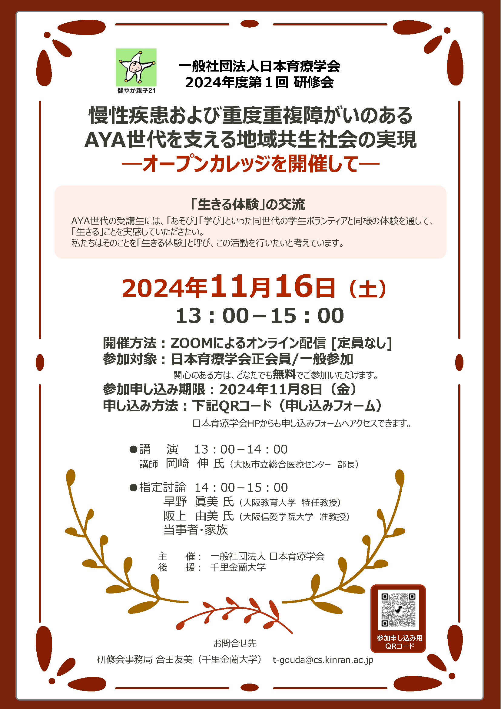 2024年11月16日に「慢性疾患および重度重複障がいのあるAYA世代を支える地域共生社会の実現ーオープンカレッジを開催してー」をテーマとした研修会(主催:一般社団法人日本育療学会、後援:千里金蘭大学)が開催されます。