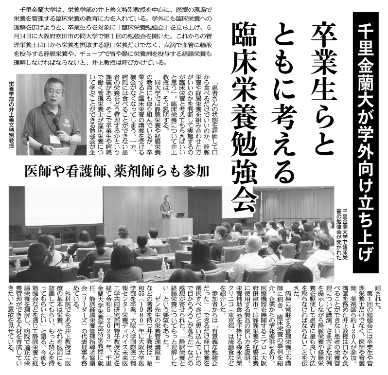 2025年6月14日、本学の井上善文教授(千里金蘭大学栄養学部栄養学科)を中心に開催された第1回「臨床栄養勉強会」の様子が、7月6日発行の産経新聞及び2025年7月10日産経ニュースに掲載されました。