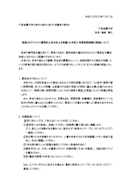 千里金蘭大学の学生の皆さん並びに保護者の皆さま